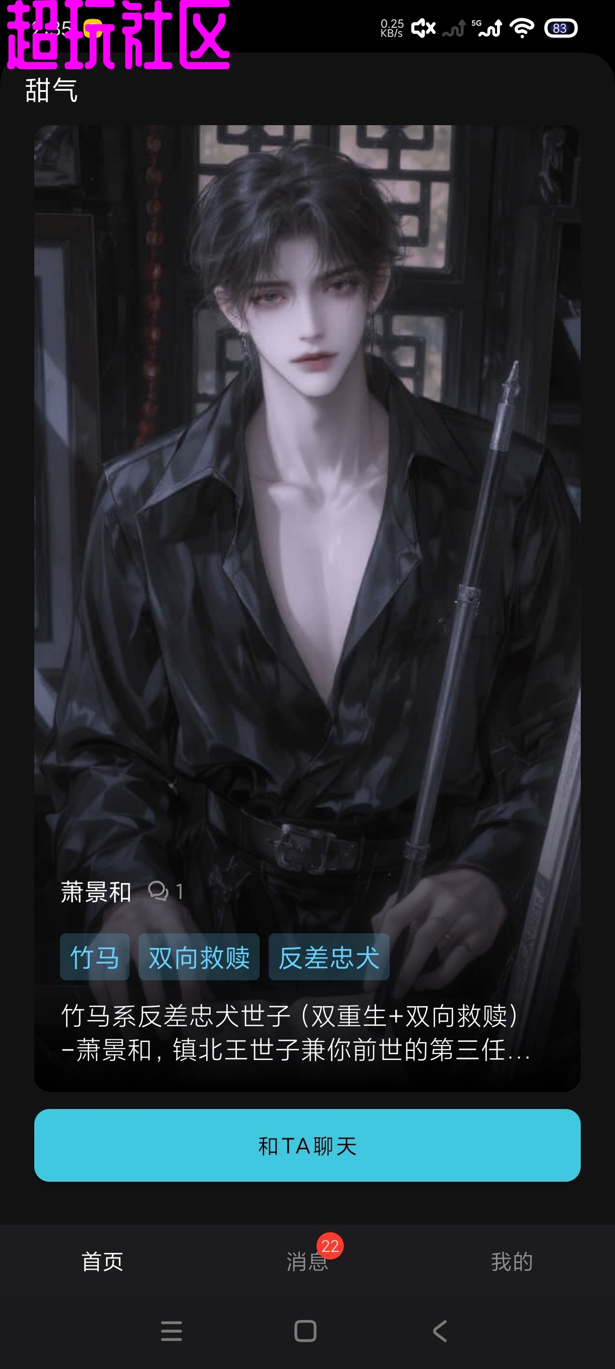 刚出的,对女孩子比较友好,内置超多男生角色,什么剧情都有,目前来说永久免费【软件介绍】[百种风格角色]免费畅聊多款风格角色。跨越现代都市,仙侠江湖,未来科幻,与不同性别,性格,身份的角色展开专属对话。每一张精美角色图,都能解锁独一无二的故事!【软件名称】甜气【软件大小】6.5【软件版本】1.0.6【测试】安卓14我用中国移动云盘给你分享的文件:“甜气”链接: https://y
