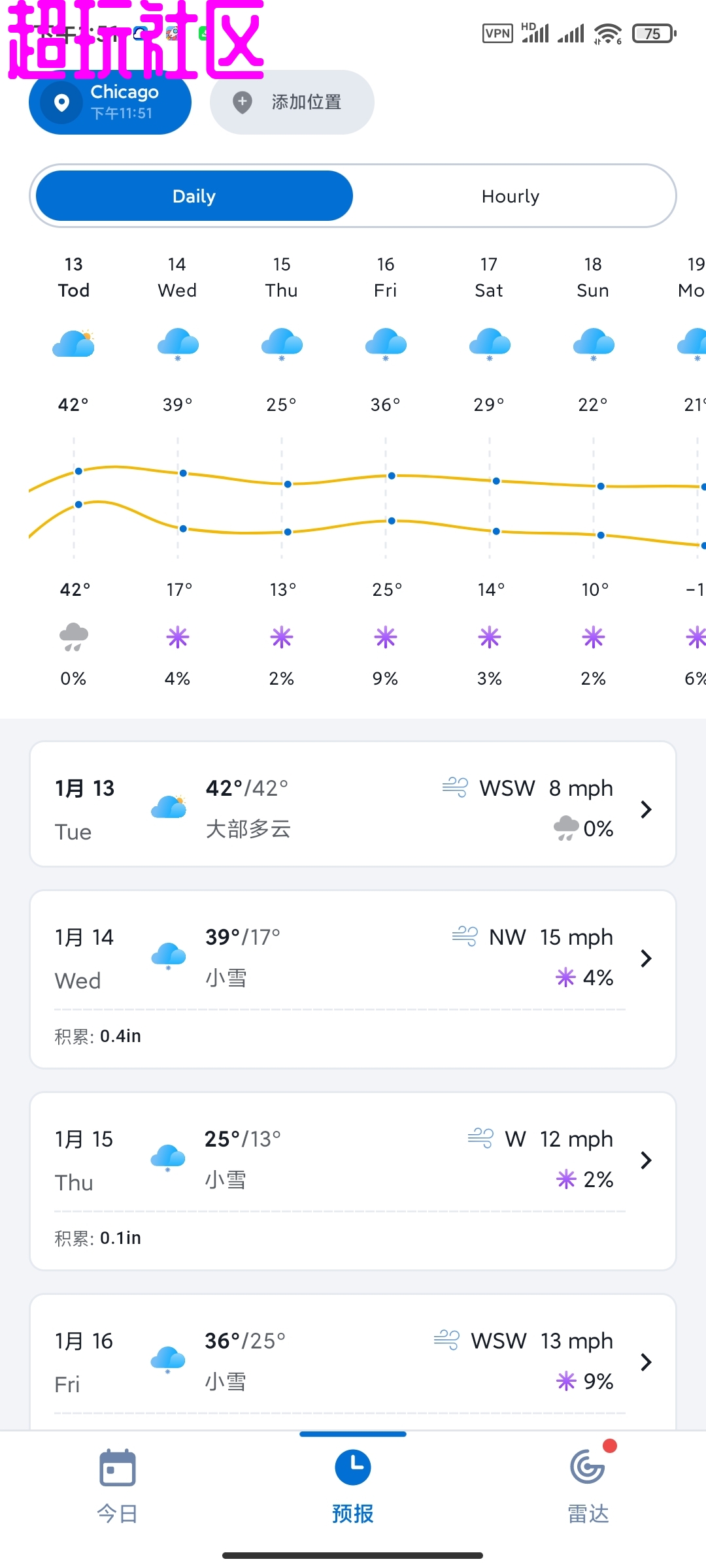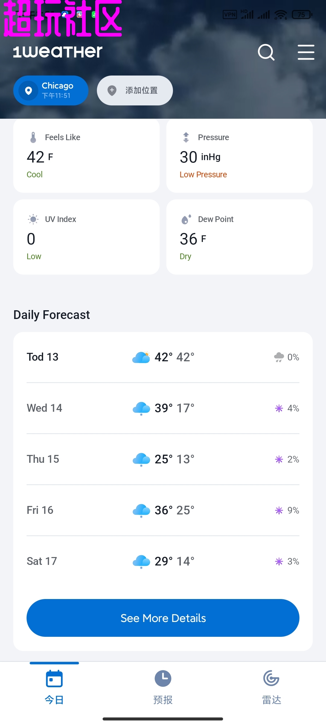 【软件介绍】1Weather 是一款专注天气信息的手机软件。它可以在手机上实时显示当前温度、降雨概率、湿度、风速等基本气象数据。用户打开应用后,第一眼就能看到所在城市的天气概况,界面简洁,文字大而清晰,方便快速获取信息。1Weather 通过精准的天气预报、交互式雷达、可自定义的警报以及丰富的健康指数,为用户提供全方位的气象服务。它的界面简洁、功能完整、使用流畅,能够帮助用户在日常生活和出行中更好